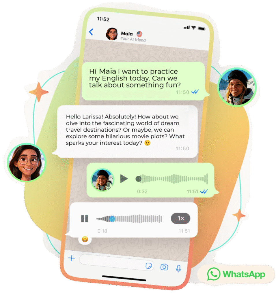 A Maia é uma inteligência artificial especializada em ensino de idiomas que funciona diretamente no WhatsApp. Você conversa com ela como se fosse um professor particular, recebendo correções, dicas e exercícios personalizados em tempo real.